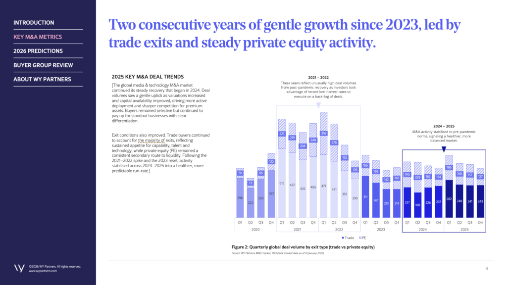 Our findings are grounded in WY’s proprietary M&A Tracker and supported by public announcements and third-party datasets (including PitchBook), enabling consistent classification and like-for-like trend analysis.