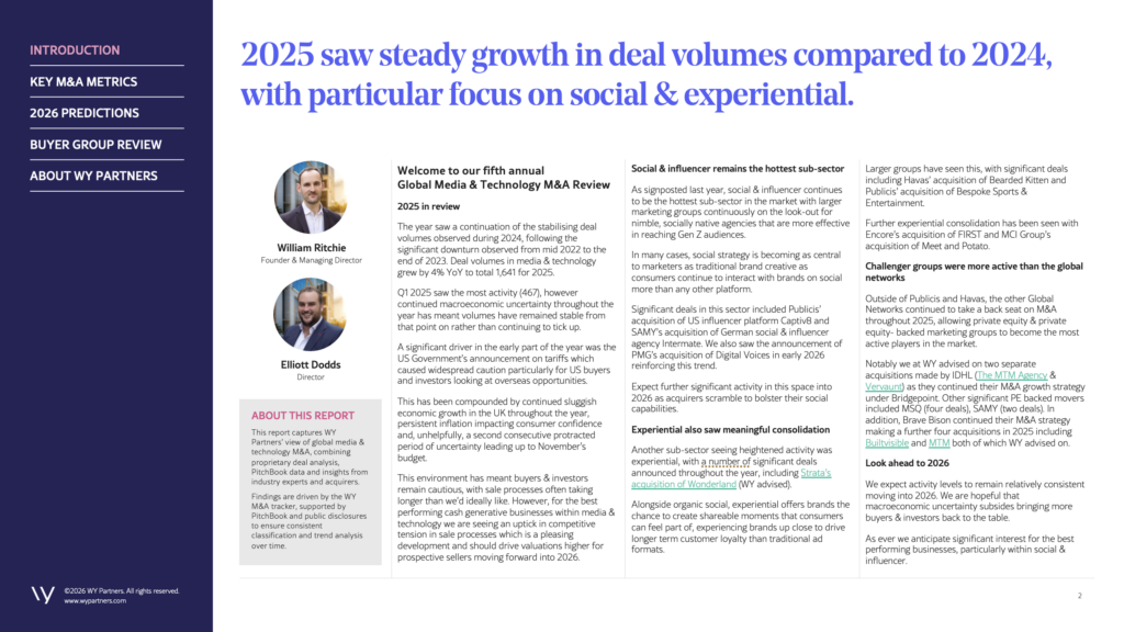 2025 saw steady growth in deal volumes compared to 2024 (+4%), with the market continuing to place particular focus on social & experiential capabilities. From a WY perspective, deal completions were up 50% on 2024 as we saw a pleasing return of competitive tension from buyers for outstanding businesses.